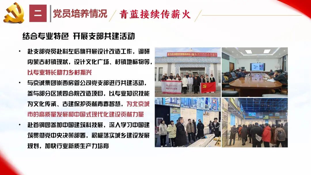 支部党员赴科左后旗开展设计改造工作,调研内蒙古村镇现状,设计文化广场、村镇地标物等,以专业特长助力乡村振兴;赴京诚集团参与建筑保护实践,感悟“工匠精神”,努力探索城市更新工作与传统文化相结合的途径,为北京城市的高质量发展贡献力量;赴首钢园参加中国建筑科技展,深入学习我国建筑业贯彻党中央决策部署、落实城乡建设发展规划、加快培育新质生产力的先进经验。