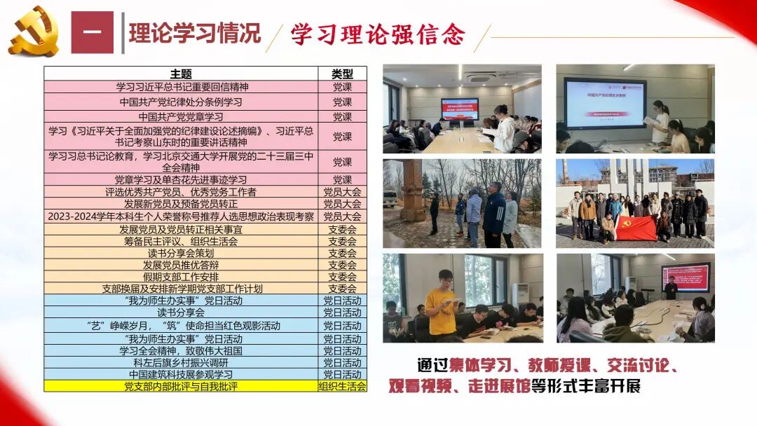 我支部在2024年全年共开展23次支部活动,通过集体学习、教师授课、交流讨论、观看视频、走进展馆等丰富形式,从理论上筑牢党员思想根基,从思想上深化政治共识、强化政治认同。
