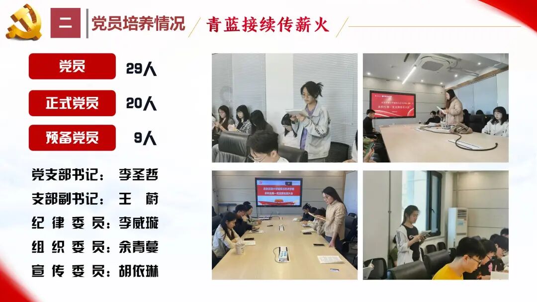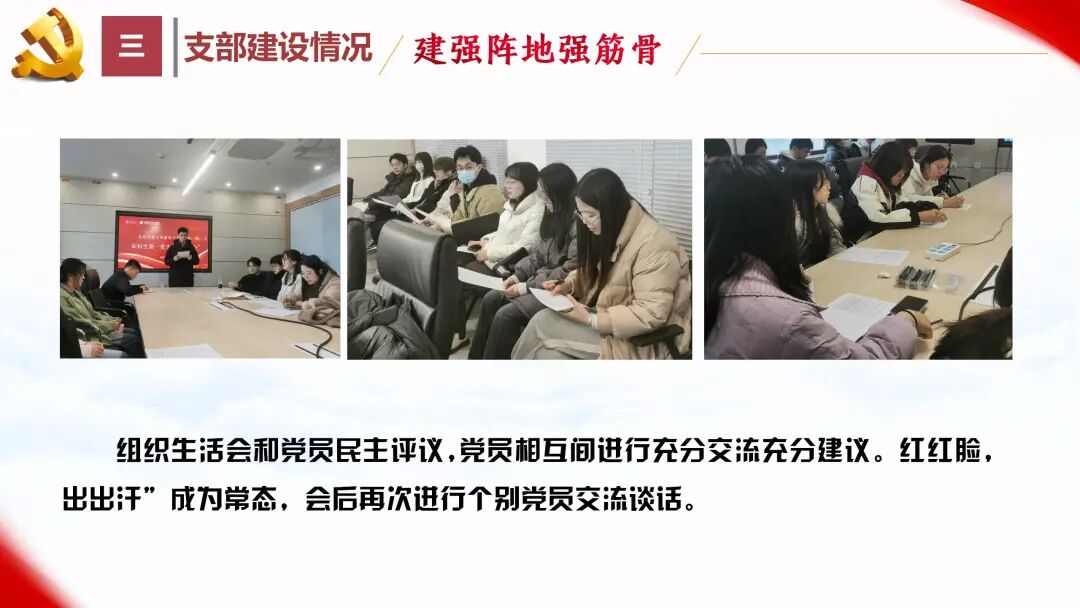 截至24年底,支部共有党员29人,其中正式党员20人,预备党员9人。支部设立党支部副书记、纪律委员、组织委员、宣传委员等职务,并将每月第一周的周四确定为主题党日,定期按时组织党员开展集中学习、党员服务等活动,确保组织生活规范化。