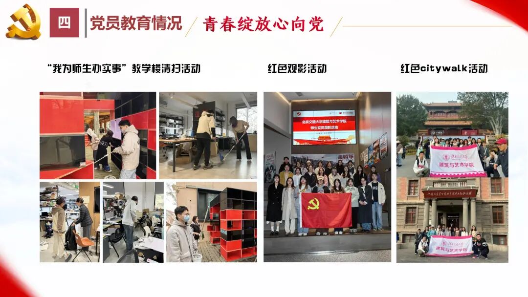 开展“我为师生办实事”教学楼清扫活动,回信精神学习分享、支部书记讲党课。观看志愿军电影,坚定理想信念。组织开展红色city walk活动,党建带团建,现已开展北大红楼、129纪念亭、虎坊桥京华印书局三期,传承革命精神,赓续红色血脉。