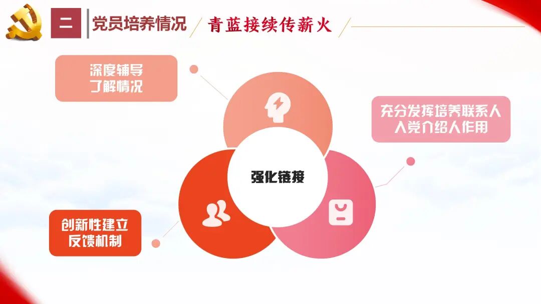 支部书记结合相关活动与党员本人开展深度辅导,及时了解党员近期情况。充分发挥培养联系人、入党介绍人的培养、联系和监督作用,确保党员发展过程严谨规范。创新建立反馈机制,在培养发展过程的关键节点,发现问题及时向党员本人反馈,并给予针对性指导,确保问题及时解决。