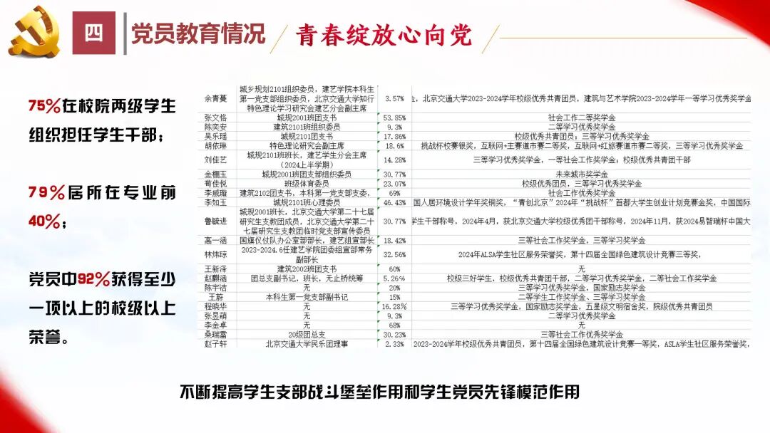 2024年,我支部党员75%在校院两级学生组织担任学生干部、79%的党员学习成绩居所在专业的前40%;党员中92%获得至少一项以上的校级以上荣誉,充分发挥党员先锋模范带头作用。