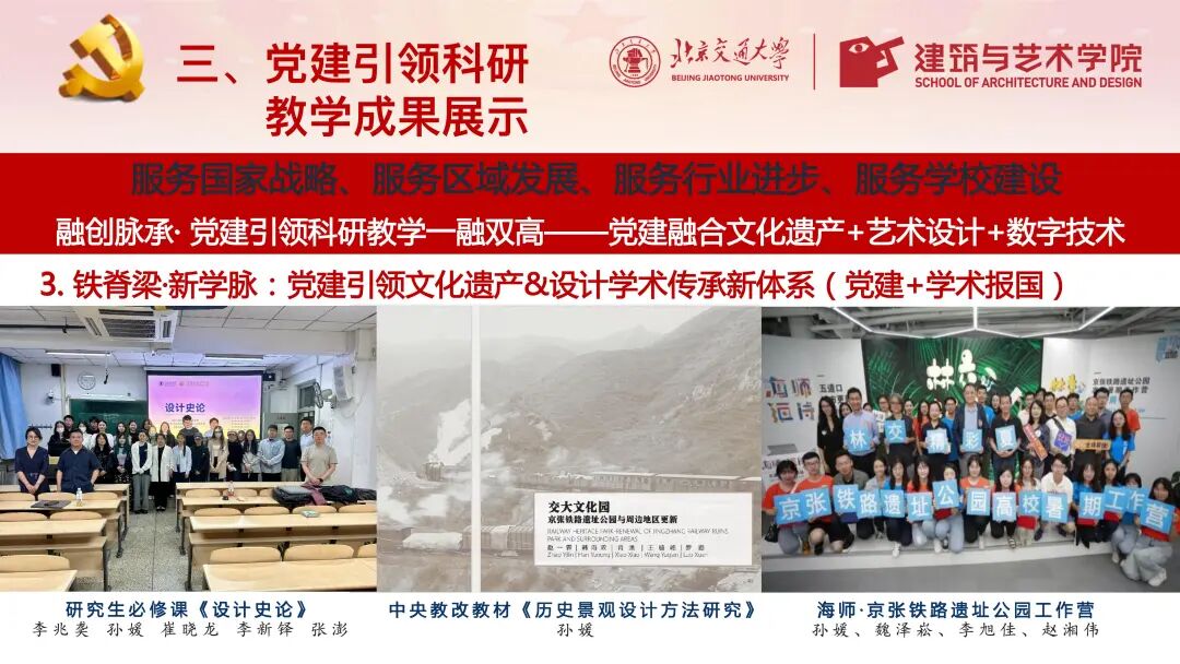 集体记忆是立德树人的情感纽带、文化基因是课程创新的内容源泉、遗产景观是教育实践的活态实验室、交叉设计打通从认知到践行的转化通道。设计系教师党支部以“融创脉承· 党建引领科研教学一融双高”为目标,凝练党建融合文化遗产、艺术设计、数字技术的特色工作方法。