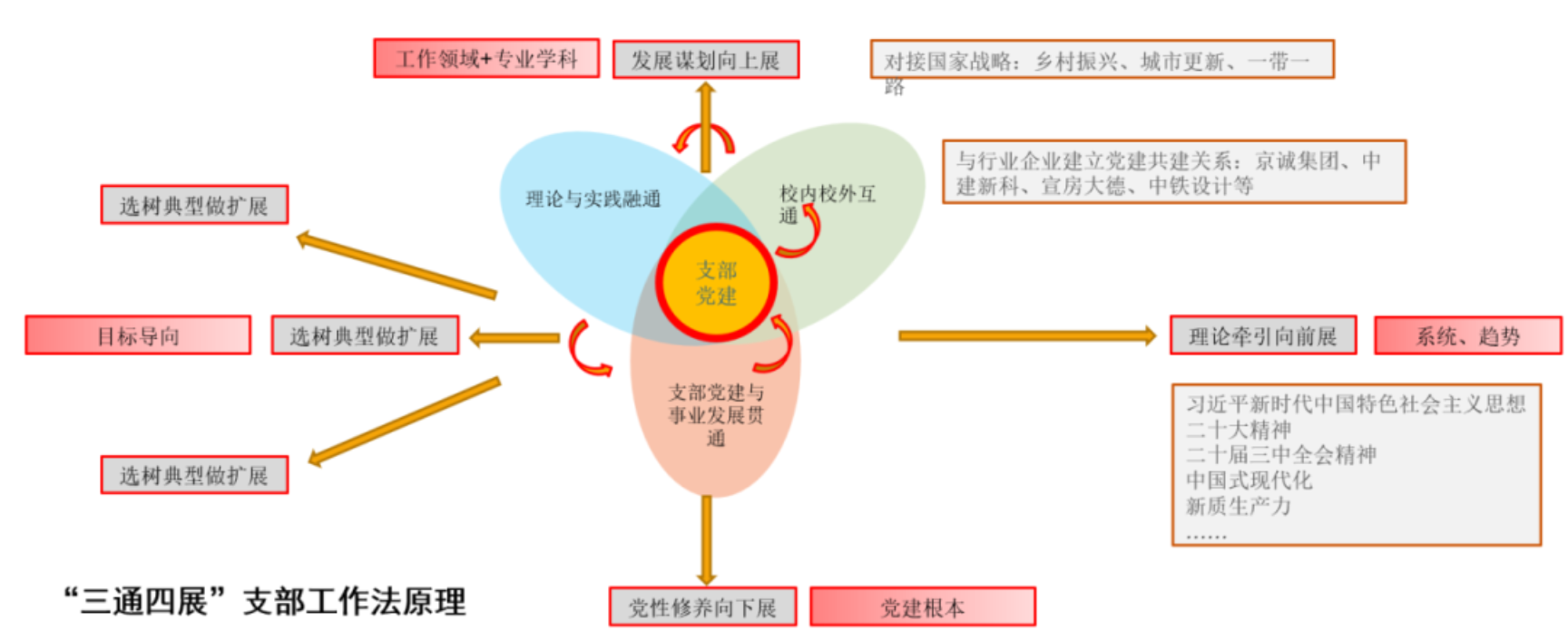支部凝练形成有力推动“一融双高”取得实效的“三通四展”支部工作法,首先通过理论学习实现方向引领,再找准服务国家战略的结合点;之后通过党建共建拓展核心事业发展的平台,并通过党员的努力奉献形成示范引领,从而实现党性修养和社会影响双丰收的效果。
