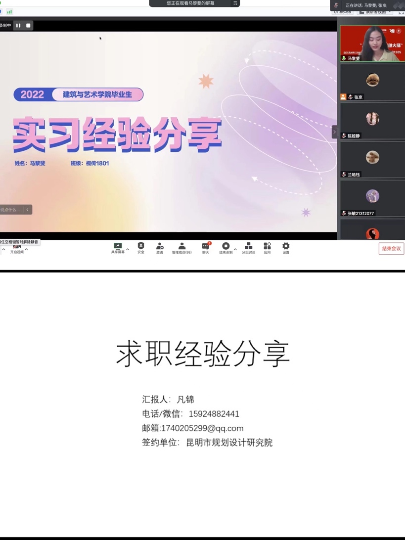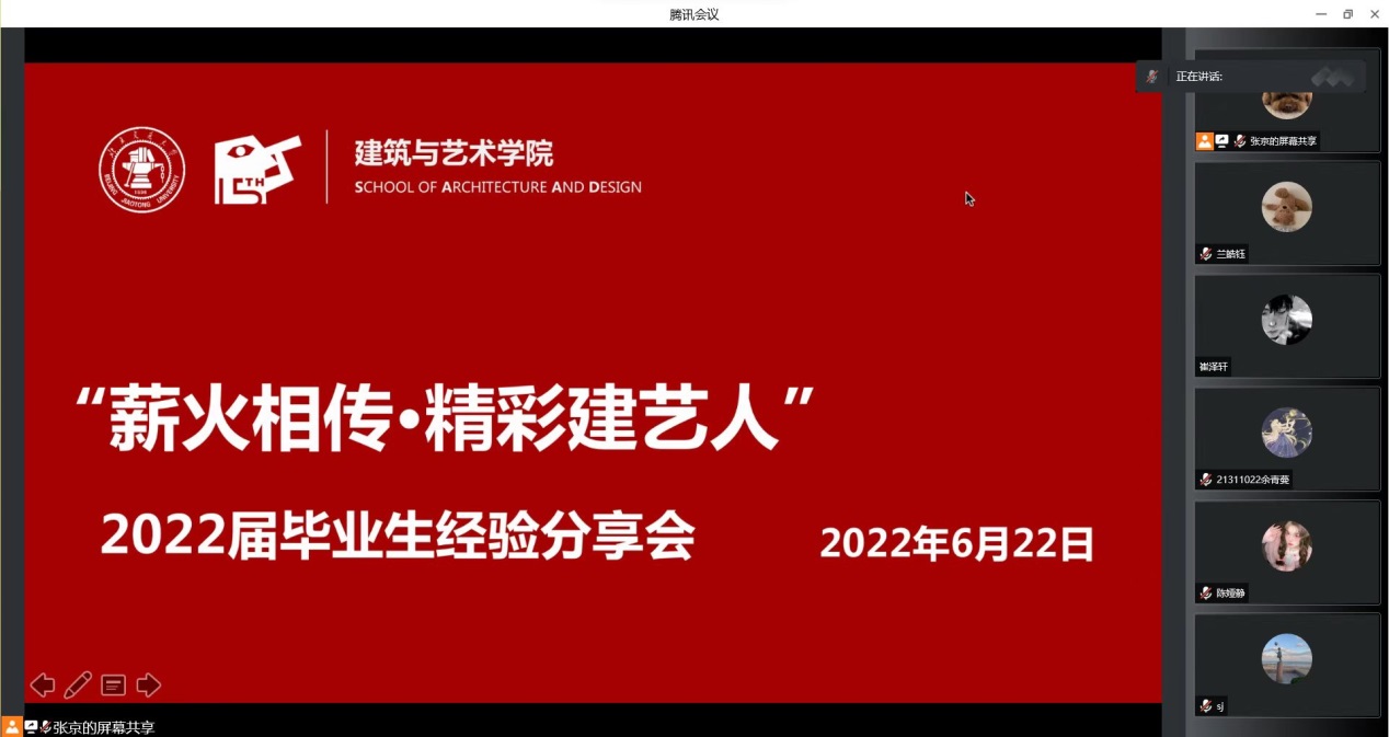 为了提升在校生学业与职业生涯规划意识,积极面对学业就业压力,6月23日下午,艾米直播 通过腾讯会议平台举办“薪火相传,精彩建艺人——学长来了”毕业生经验分享会。分享会邀请了学院22届毕业生兰皓钰、马舒媛、杨小乐、王浩骏、马黎斐、凡锦六位同学为19、20、21级在校生做升学、出国、求职经验分享。本次分享会吸引近100名在校生收看交流,会议由学院学工办主任张京主持。