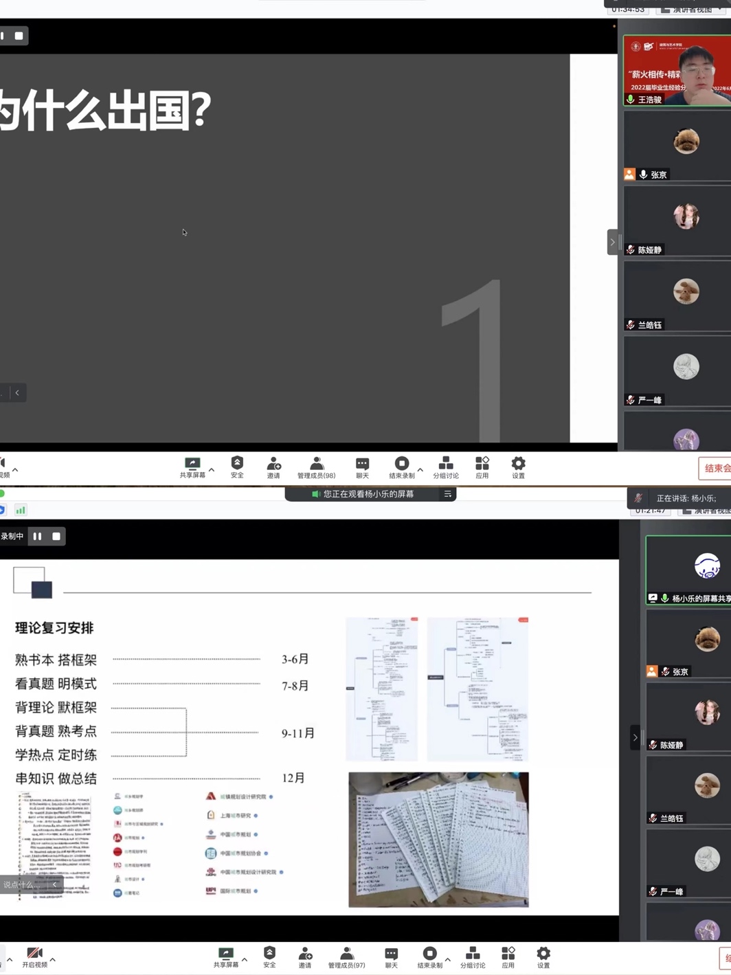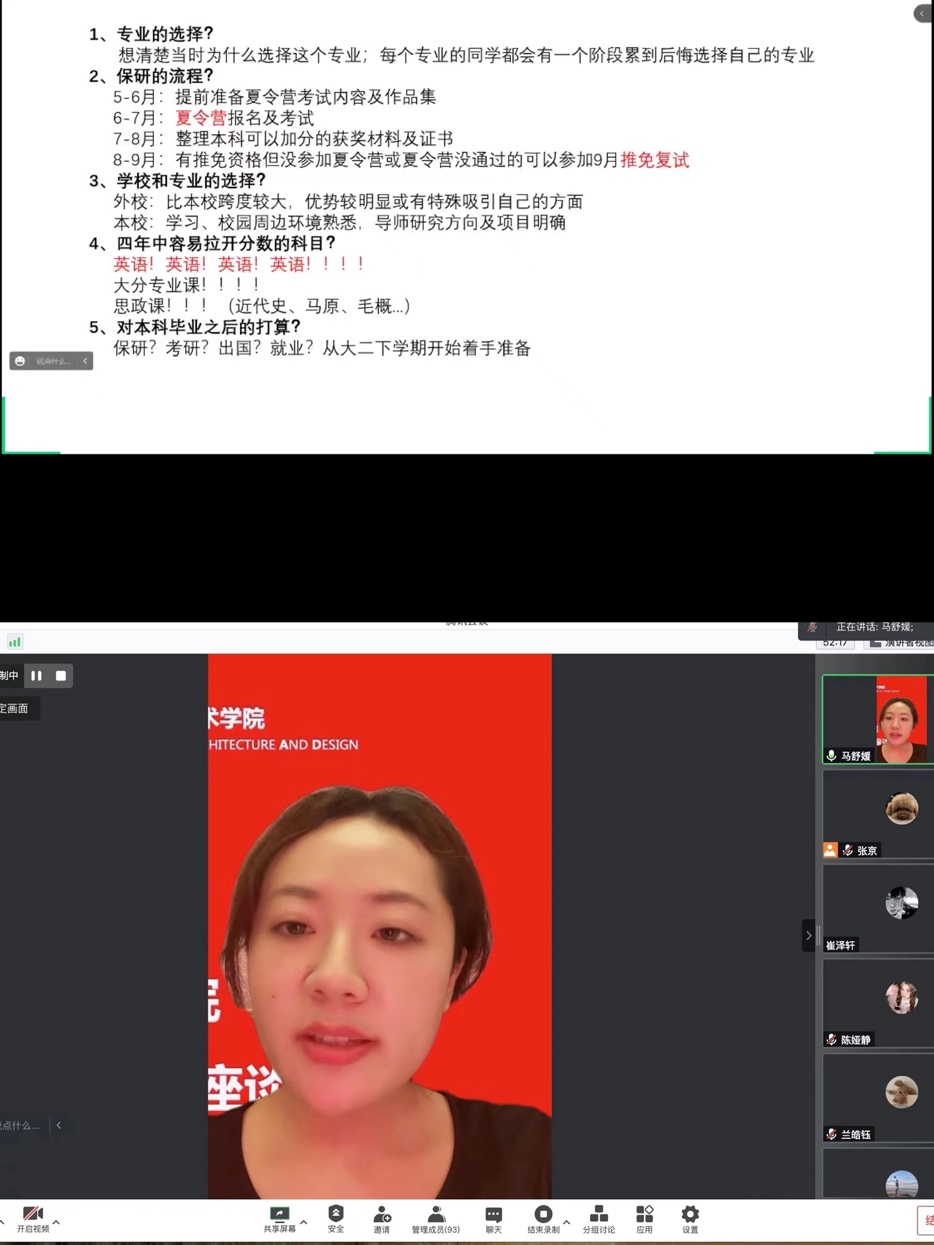 王浩骏同学分享了建筑专业应对出国学校选择、申请材料准备等经验及技巧,提醒同学们高效利用暑期时间,丰富自己的核心竞争力。