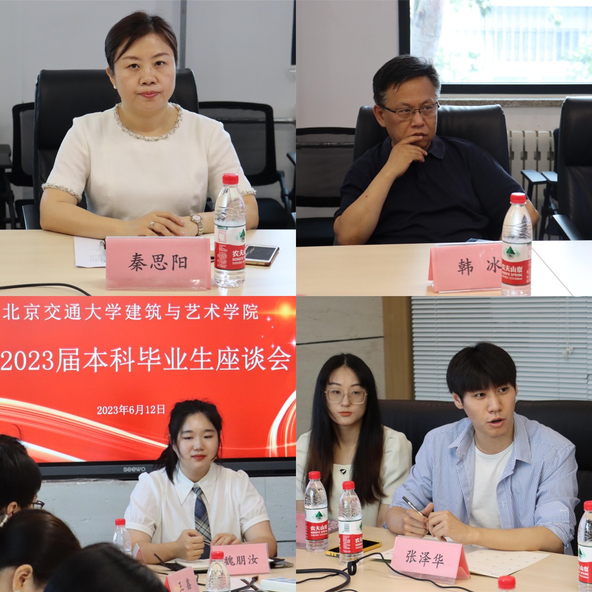 2023年6月12日上午,艾米直播 在学院三层会议室分两场举行2023届本研毕业生座谈会。学院党委书记秦思阳、院长韩冰、党委副书记刘萍、副院长佘高红、副院长张野、建筑系主任盛强、规划系主任王鑫、设计系主任王征、学工办主任张京、毕业生辅导员张帅、董博宇以及本研毕业生代表参加分别参加两场座谈会。