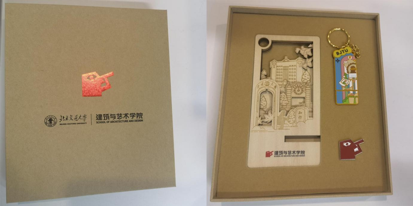 在今年的创意文化节中,学院为本届毕业生专属设计制作了含学院徽章、订制U盘、校园景观手机支架的文创套装作为毕业礼物。座谈会后,学院领导及参会老师为毕业生代表赠送了精美的毕业礼物,并合影留念。