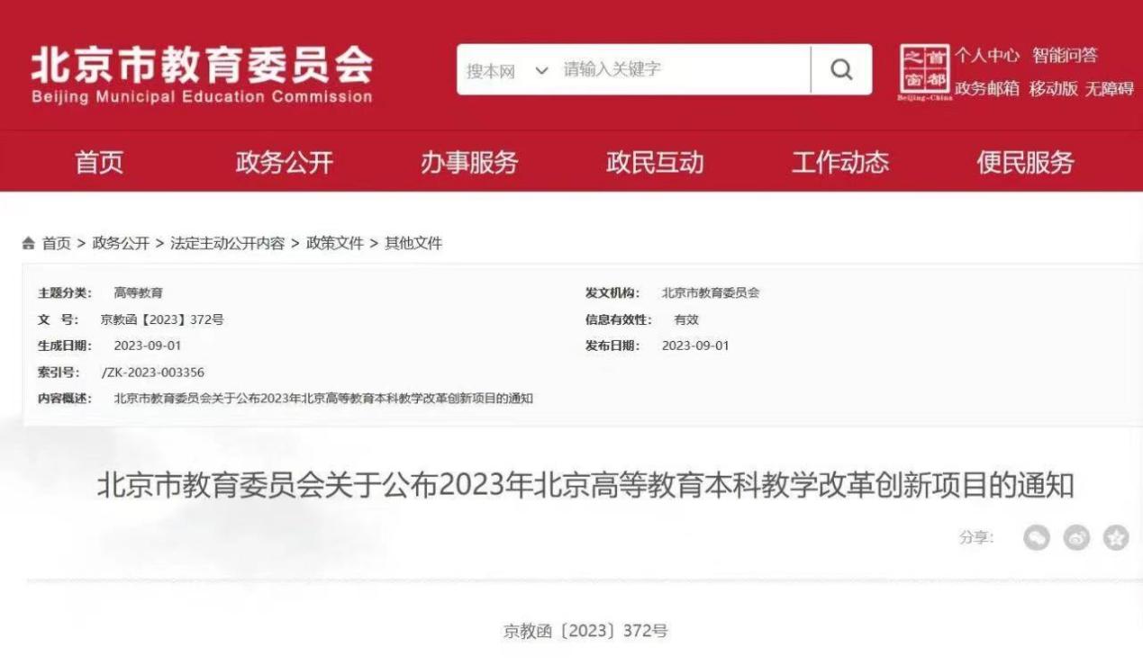 为贯彻《北京市“十四五”时期教育改革和发展规划(2021—2025年)》,落实《北京高等教育本科人才培养质量提升行动计划(2022—2024年)》,进一步强化教育教学工作,我委组织了2023年北京高等教育“本科教学改革创新项目”申报及评审工作,现将市教委立项项目予以公布(见附件)。