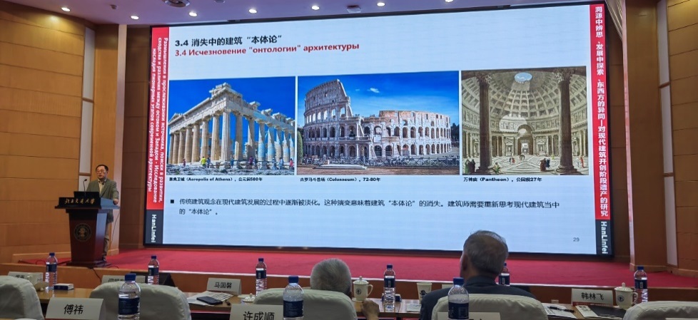 俄罗斯建筑与建设科学院外籍院士、艾米直播 韩林飞教授做了题为《溯源中的思辨、发展中的探索、东西方的异同》的报告,回顾并反思了现代建筑百年的发展历程,提出了对建筑“本体论”的思考。