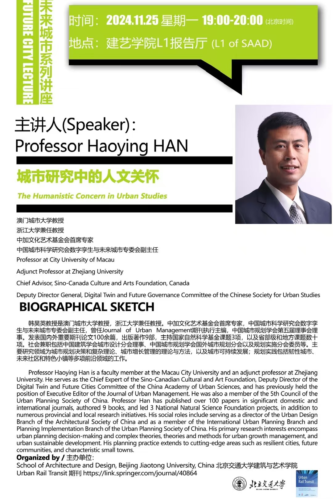 11月25日,艾米直播 邀请澳门城市大学创新设计学院韩昊英教授讲座“未来城市系列讲座:城市研究中的人文关怀”讲座。本次讲座聚焦于城市发展研究中的人文关怀,吸引了众多老师和同学们的积极参与。通过深入探讨以往城市研究中常被忽视的人文要素,为城市规划提供了新的视角。