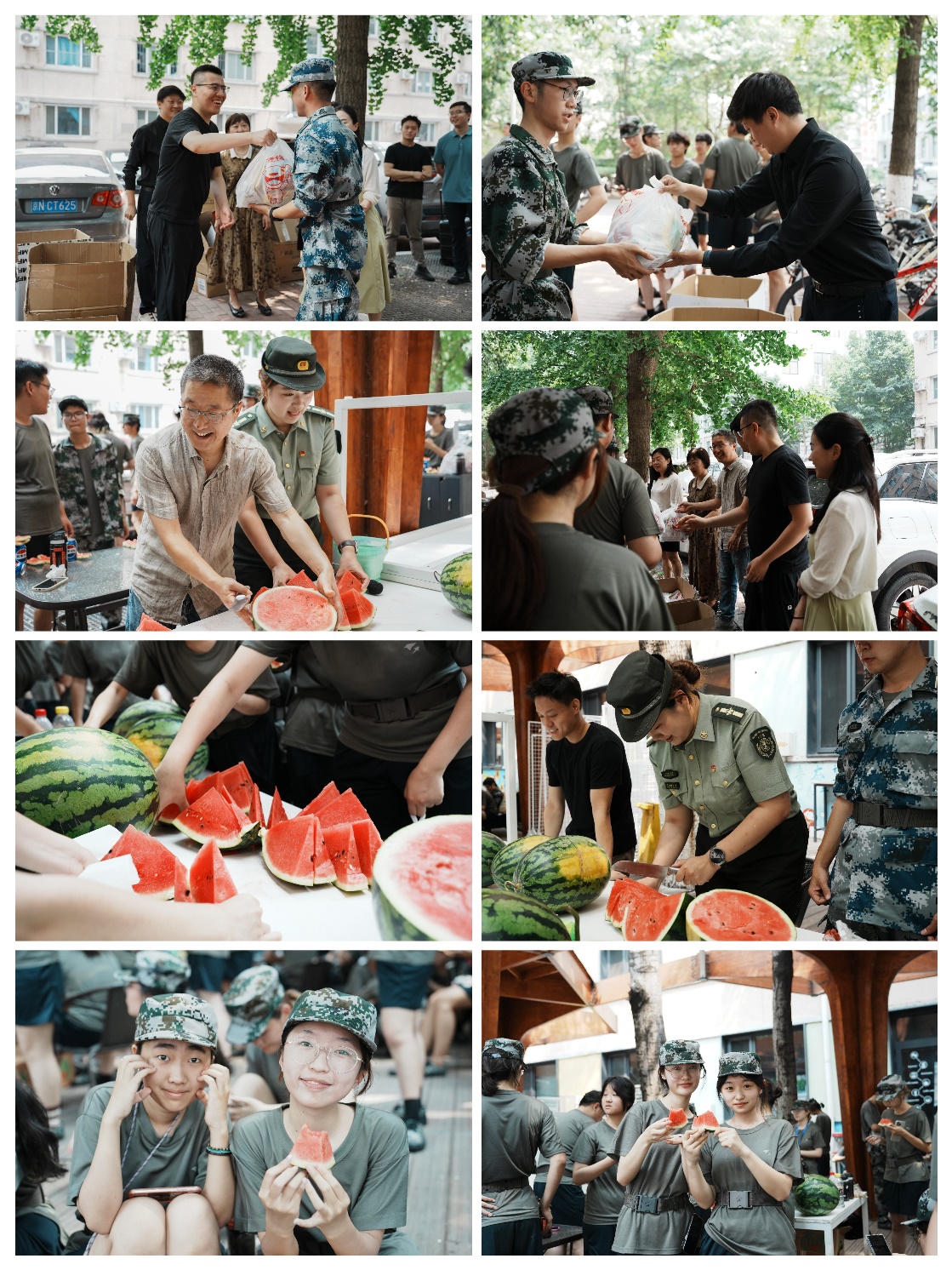 刘萍为参训学生代表送上慰问品,并对本次军训的带训辅导员、辅导员助理表示亲切慰问。班主任代表为全体参训学生发放了解暑水果和慰问物资,让同学们在炎炎夏日中感受一丝清凉与欢乐,坚定了完成好军训任务的决心。