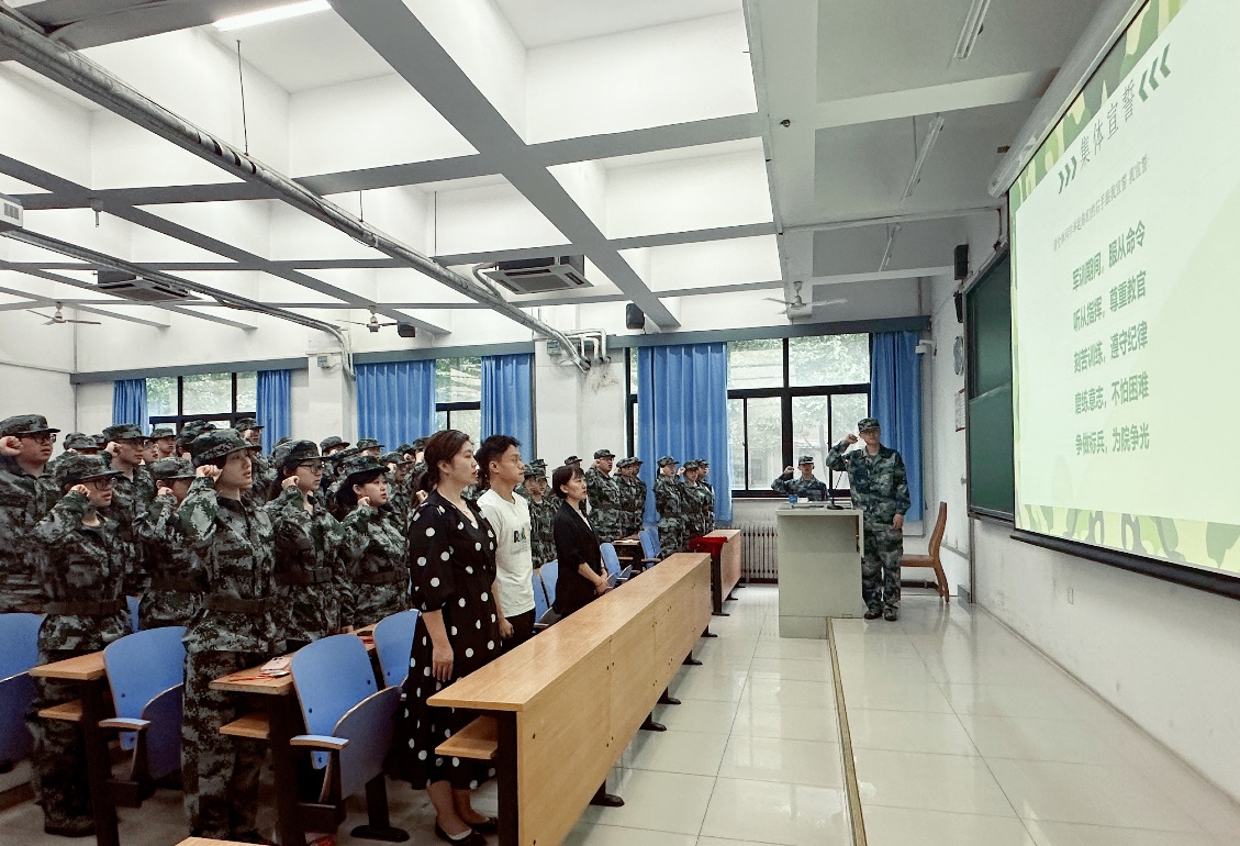 李圣哲带领同学集体宣誓,做到“军训期间,服从命领;听从指挥,尊重教官;刻苦训练,遵守纪律;磨练意志,不怕困难;争做标兵,为院争光”。