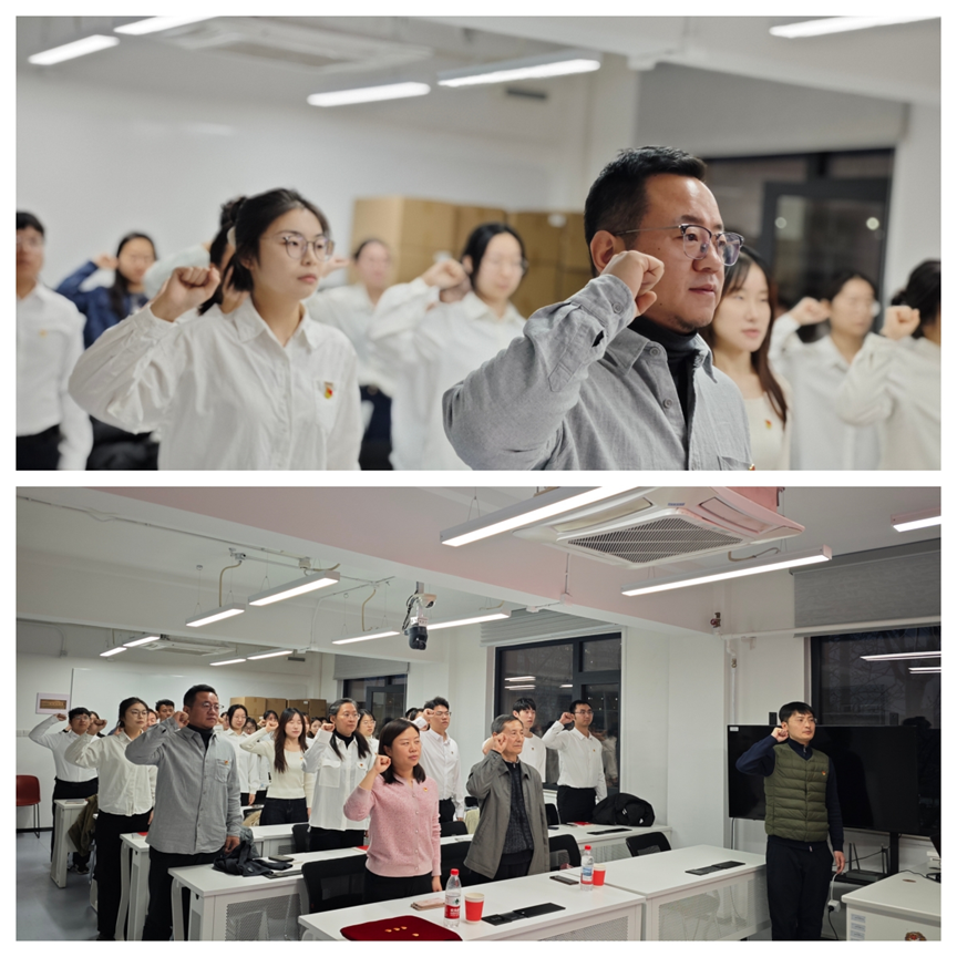 在张帅的领誓下,27名新发展党员面向党旗,举起右拳,庄严宣誓。铿锵有力的誓言在教室里回荡,诉说着他们为党和人民事业奋斗终身的决心。
