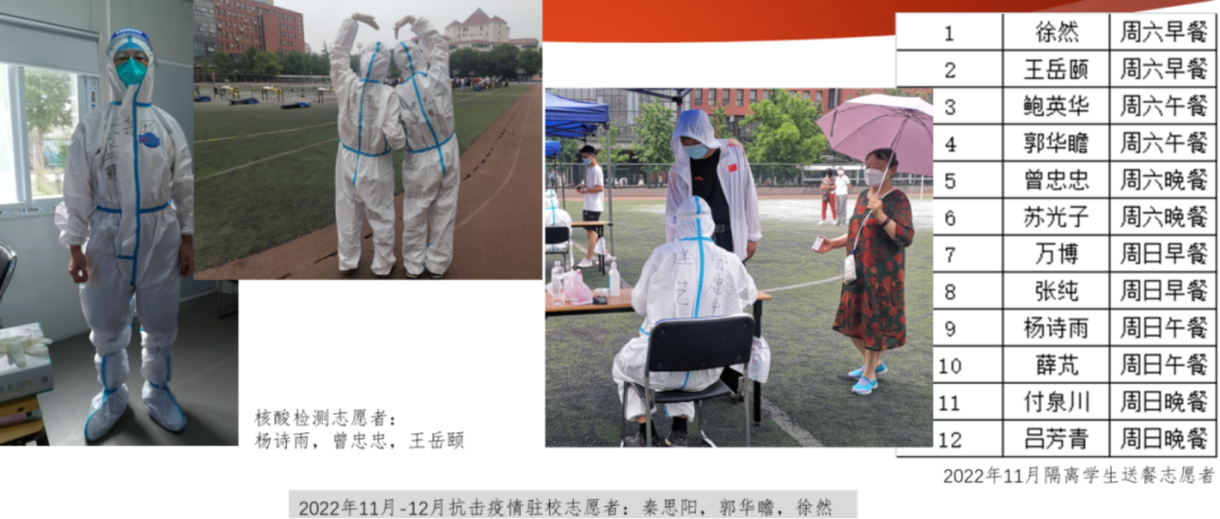 疫情期间,支部4人参与校门值守、4人参与核酸检测、6人服务隔离学生、2人驻校抗疫,在特殊时期牺牲奉献,挺膺担当,守护校园师生健康。