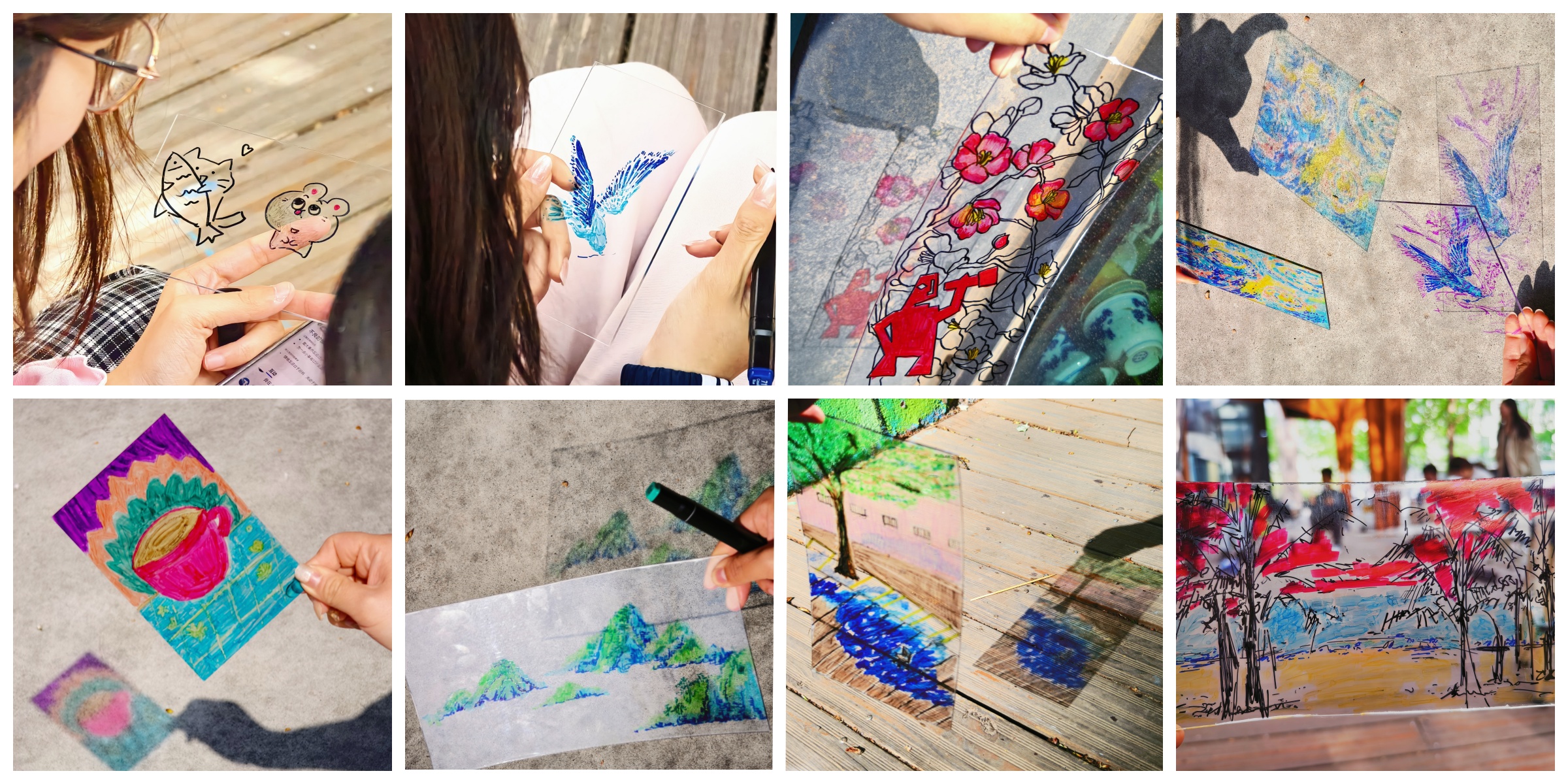 本次活动的创作形式为彩色玻璃画,艾米直播 学工办主任张京带领参与者专注于自身的情绪,回想曾经感受到压力的时刻,并思考通过何种方式能够缓解内心的压力。接下来,朋辈导师引导参与者将缓解压力的方法画出来,并将情绪转化为颜色,在透明的玻璃上精心勾勒轮廓、填充色彩。坐在伞亭内,享受着微风,让大家更加沉浸在艺术创作的宁静与美好之中,分享作品创作和自己调节压力的方法。创作完成后,师生们手持玻璃画作品移步至阳光下,光线穿过化作,五彩斑斓的色彩在地面上晕染开来,交织出如梦似幻的光影。